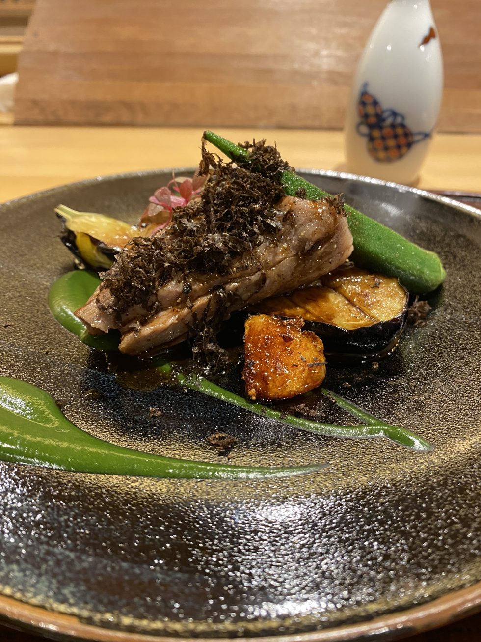 大将は若干32歳。料理人としてのスタートは美食の町リヨン郊外の三つ星レストラン。そこを皮切りにフランス国内の店を数店舗渡り歩いた後、日本に帰国。その後は、一転して和食の店で修行をして、この店で料理長となった。すでに昨年ミシュラン1つ星を獲得している。京料理とフランス料理の融合というのが売り文句だが、ジョーはフランス料理の要素は少ないと思っている。味付けは伝統的な和食の法則に則っていて、奇をてらった皿は少ない。特筆すべきは野菜の美味しさ。魚や肉も必ず季節の野菜と共に供され、その調和が素晴らしい。大将が選択する野菜はメイン食材の味を邪魔せず引き立てながらも単なる脇役には終わらせない。ほとんどの野菜を大将自らが仕入れるている。時に生産地に赴き、作り手との会話を欠かさず、店に招待して自分の料理を味わってもらっているという。大将の美点は料理の腕もさることながら、こうしたコミニケーション能力の高さにあると思う。それは料理人のスタートがリヨン郊外の店だったことも関係あるかもしれない。大将がその店を選んだのは、特別な理由はなくて「日本人が誰もいなかったから」だという。フランス語が覚束ない中でのスタートは彼のコミケーション能力を向上させたに違いない。この先さらなる名店となる予感しかしない。