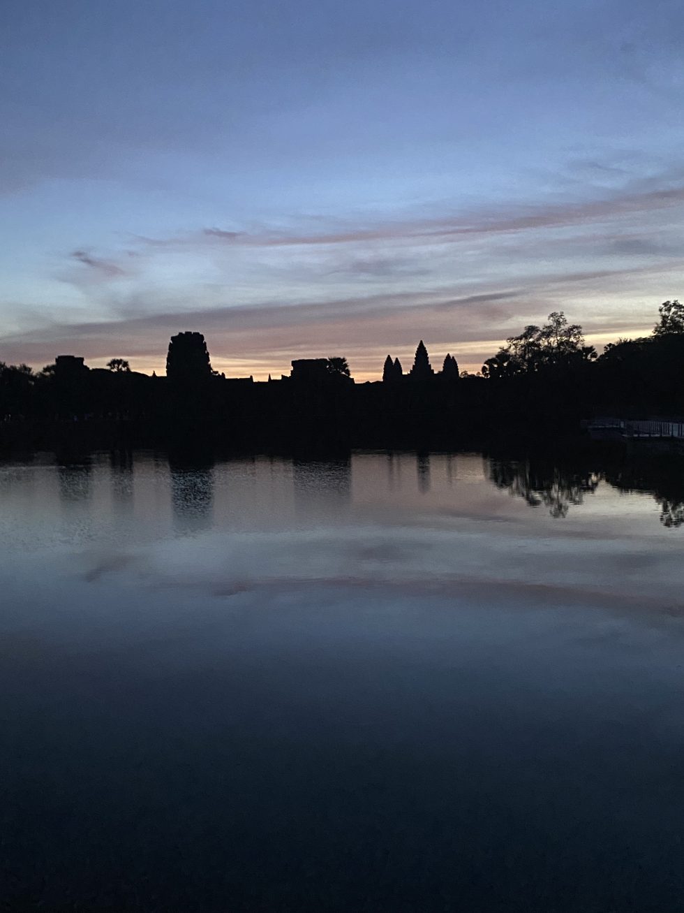 券売所を再出発する頃、夜が白々と開け始め、王宮に通じるお濠に並行する道を走る時、遠くに王宮が浮かび上がる。ジョーとサワコは感嘆の声をあげ、スマホのシャッターを何枚も切った。手前のゲートで入場券を見せ、トゥクトゥクを降りてアンコールワットへと通じる道を四人で歩き始める。前方にはぼんやりと浮かぶアンコールワット。雲が多かったけれど、夜はさらに白んでいき、アンコルワートが歩みを進める度に大きくなる。ここで一旦歩みを止め、4人で記念撮影。1000年前の王宮の右背後から日が昇りはじめ、全面は暗く浮かび上がるのは大輔が言っていたように幻想的な風景で、これだけでここに来る価値があると思う。お堀に到着するとチェックポイントがあり、再び入場券を見せて上智大学チームが改修工事中の王宮へと通じる橋を渡る。すぐそばの西塔門から境内に入り、参道を数百メートル進むと王宮前の右手にある池へと急ぐ。