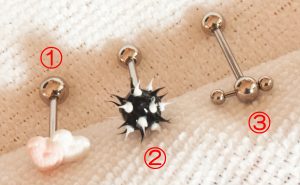 左から、①ハートマーク二つのデザインの舌ピ、②樹脂で出来たフニャフニャした星形の舌ピ、③ボールの頭に穴が開いていて、そこにさらにバーベルが通っている形の舌ピ、である。