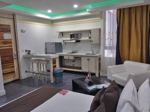 ホテルは、「メデジンのナイトライフならここ!(Medellin's #1 Nightlife District)」と呼ばれるジェラス公園(Parque lleras)から徒歩10分以内の4つ星をとりました。少し広めがいいなと選んだのが写真の部屋。スタジオルームなので、ソファー、簡易キッチン、小さいバーカウンターまであります。残念だったのは、通常の部屋は内装がシックなのに、スタジオだと簡素になってしまうこと。カジュアルな長期滞在向けなので、これは仕方がないのかも。