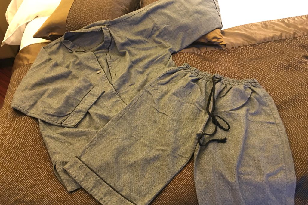 ルームウエアは上下に分かれたパジャマ。肌触りもよく、長袖で、パンツの丈はふくらはぎ下くらいです。