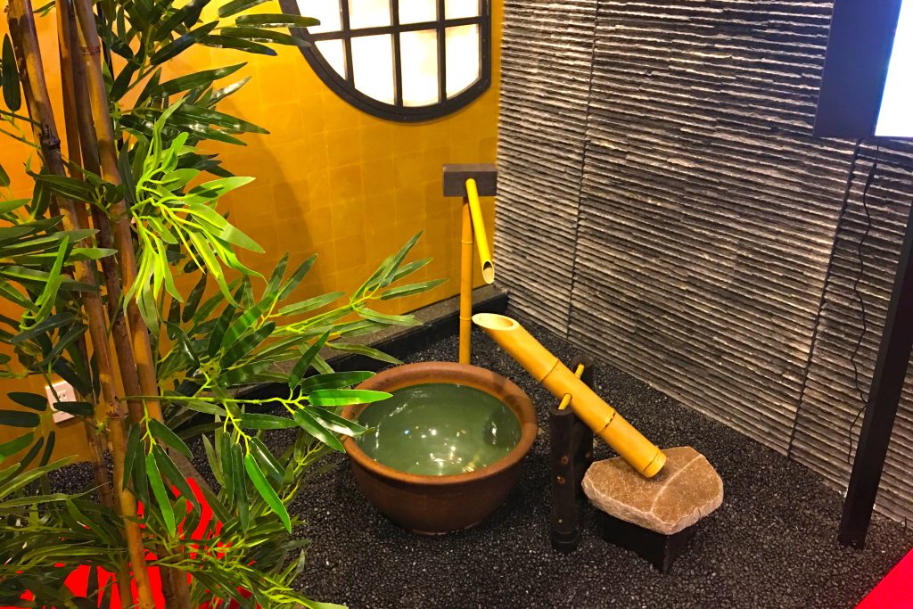 ロビーには朱色の橋や鹿威しがあり、まるで日本庭園のよう。