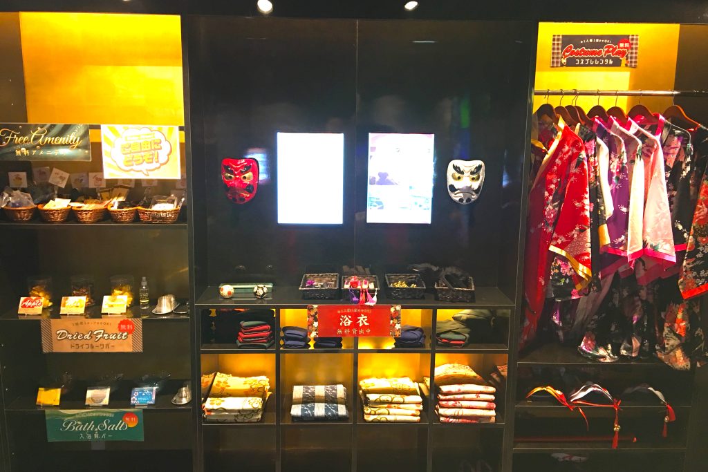 旅館のような浴衣の無料レンタルもロビーにありますし、無料アメニティやドライフルーツ、ナッツ、お酢ドリンクなどのウェルカムサービスもあり、入浴剤バイキングもあります。