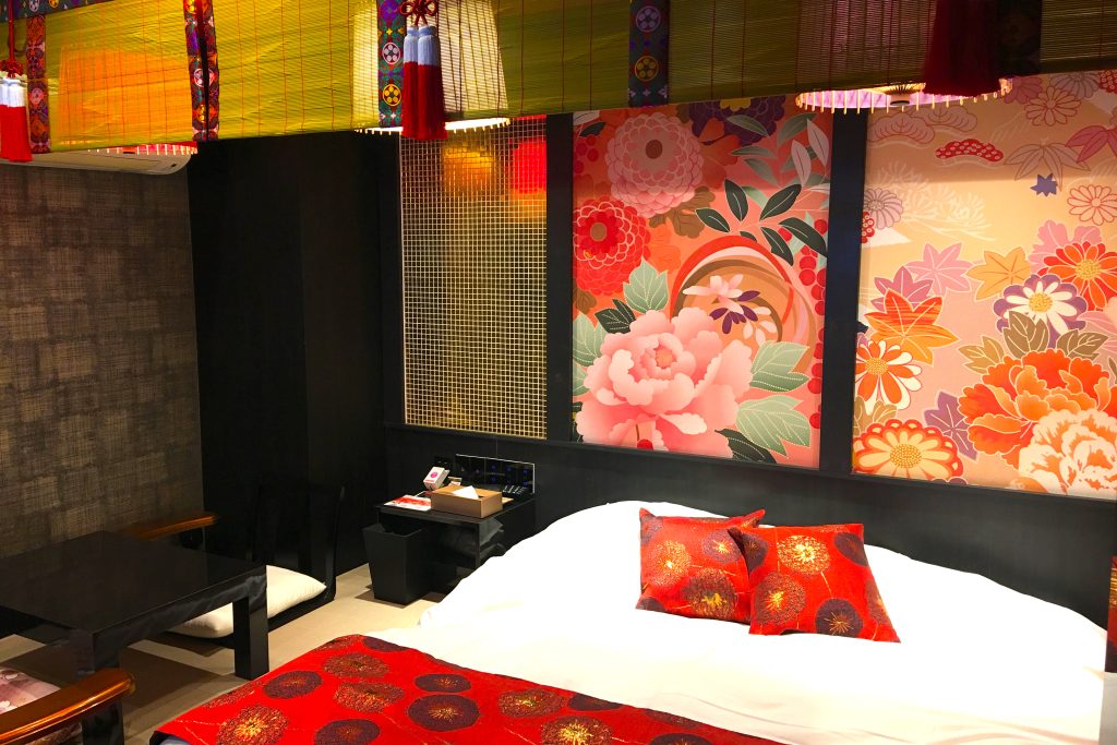 写真の207号室は、人気の花魁ルーム。艶やかな雰囲気の和モダンなお部屋。