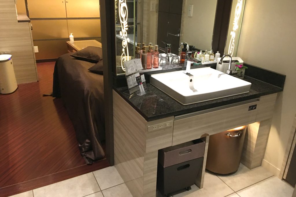 ブラウンとゴールドを基調にした大人っぽいお部屋で、お部屋に入ってすぐ目に飛び込んでくるのは、天井まである大きな鏡がゴージャスな洗面台。