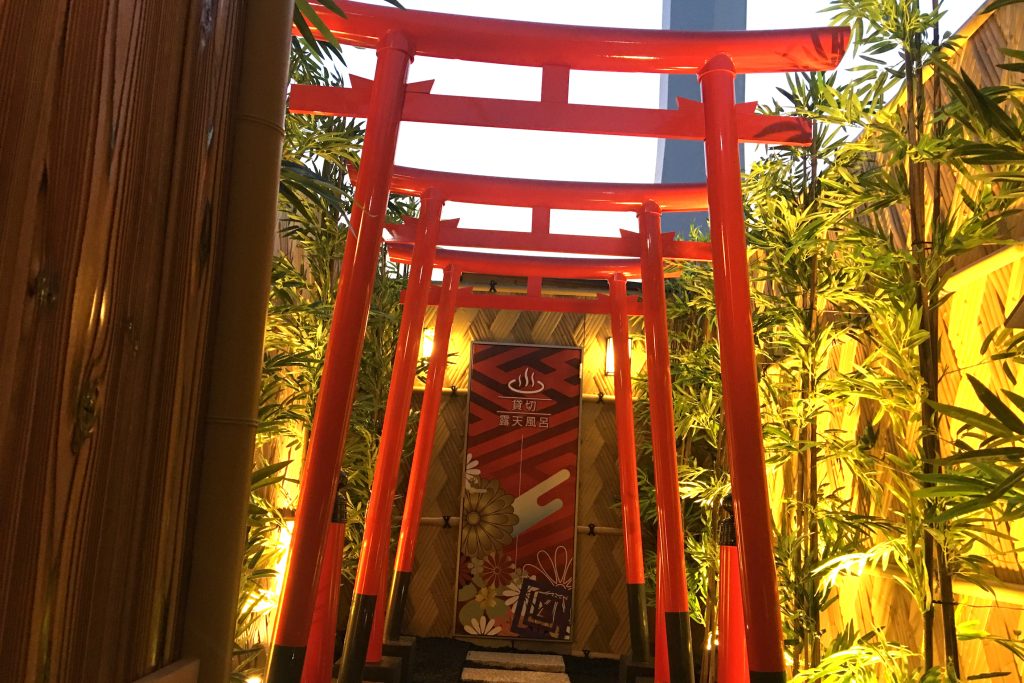この赤い鳥居の先には、信楽焼の貸切個室露天風呂があります。