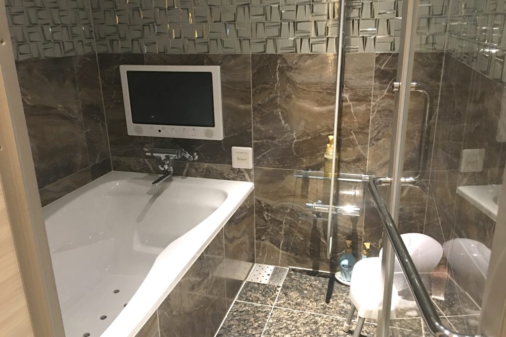 洗面台の後方には、ベージュの大理石が気品を感じさせるゴージャスなバスルームが! 浴室テレビもあり、シャワーヘッドも大きくてお湯の出も良いです。