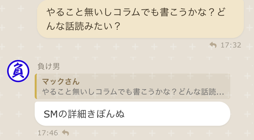 ある日の夕方、夜デートの女の子から「到着9時過ぎになります」と連絡が来て時間が空いてしまったので、「やること無いしコラムでも書こうかな?どんな話読みたい?」と呟いてみた。すぐに負け男さんから「SMの詳細きぼんぬ」と返信がきた。